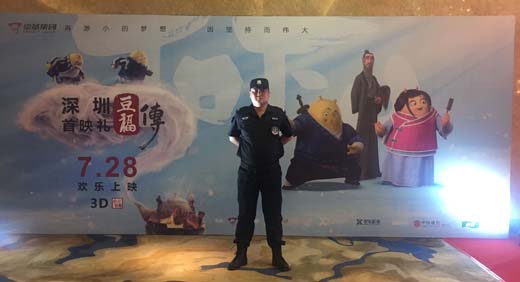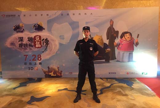 2017年7月26日我司派駐特勤安保人員26人參加了《豆福傳》在深圳舉辦的上映開幕式活動。《豆福傳》是深圳市京基動畫設計有限公司出品,鄒燚執導,陳佩斯、李立群、季冠霖、付博文等實力配音演員傾情加盟的3D歡樂修仙動畫電影《豆福傳》于2017年7月28日登陸各大院線。