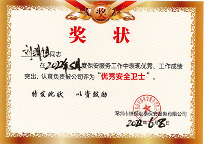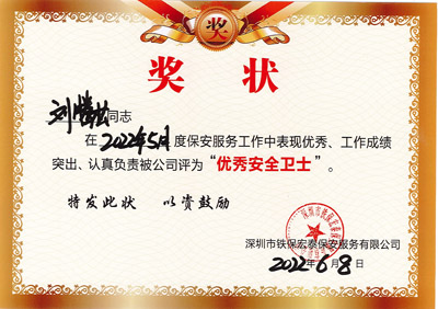 熱烈祝賀我司鐵保宏泰深圳保安服務公司安保隊員劉文兵、劉騰其、劉明旭三位同志在2022年5月保安服務工作中表現優秀、工作成績突出、認真負責被公司評為“優秀安全衛士”。