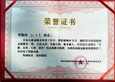 熱烈祝賀我司鐵保宏泰深圳保安公司的優秀安保護衛人員在抗擊新冠肺炎疫情工作中,積極響應號召,踴躍投身疫情防控志愿服務一線,無私無畏,奉獻自我,服務他人,以實際行動踐行“奉獻、友愛、互助、進步”的志愿服務精神,為我街道新冠肺炎疫情防控工作作出了積極貢獻。特頒發榮譽證書。