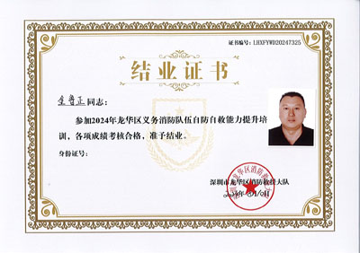 熱烈祝賀我司鐵保宏泰深圳保安公司龔文得、周建軍、趙元紅、金魯正、張晴等同志參加2024年龍華區義務消防隊伍自防自救能力提升培訓,各項成績考核合格特發此結業證。