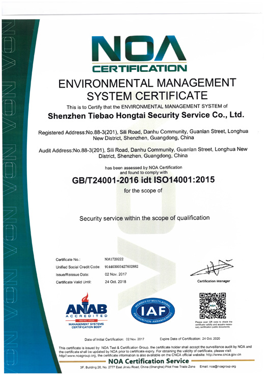 熱烈祝賀我司深圳市鐵保宏泰保安服務有限公司榮獲環(huán)境管理體系認證證書(英文版),GB/T24001-2016 idt ISO14001:2015 標準。認證范圍:資質范圍內保安服務。