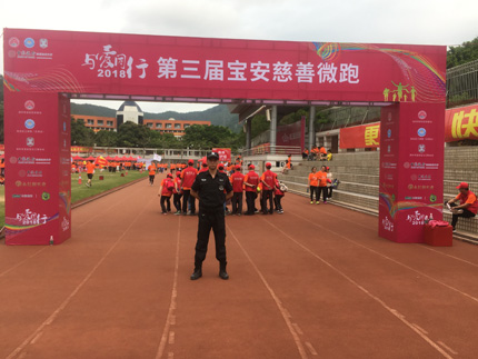 4月15日,與愛同行——第二屆寶安慈善微跑活動在寶安區鳳凰山開跑。活動匯集了約3000名穿橙色T恤衫的跑友,超過去年的1500名,現場刮起了一陣橙色風暴。考慮到參與者身體素質的不同,本次微跑活動分為5公里與10公里兩種距離的折返跑,跑友們可根據實際情況選擇。微跑沿途設有多個飲用水補給站免費為跑友們提供茶水,還有醫務人員陪跑,隨時為跑友提供醫療幫助,更有義工一路為跑友指引、加油。我司鐵保宏泰保安公司為本次活動提供了安保護衛活動。