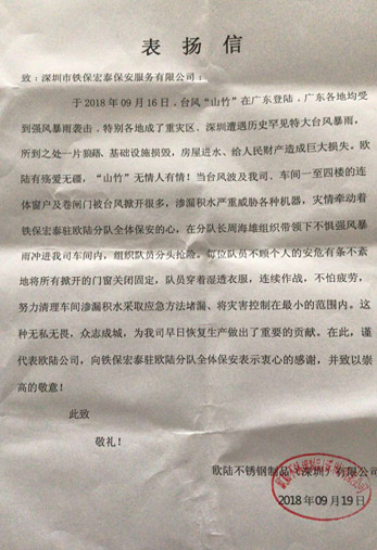 于2018年09月16日.臺風"山竹"在廣東登陸,廣東各地均受到強風暴雨襲擊.特別各地成了重災區、深圳遭遇歷史罕見特大臺風暴雨,所到之處一片狼藉、基礎設施損毀,房屋進水、給人民財產造成巨大損失。歐陸有殤愛無疆,“山竹”無情人有情!當臺風波及我司、車間一至四樓的連體窗戶及卷閘門被臺風掀開很多,滲漏積水嚴重威脅各種機器,災情牽動著鐵保宏泰駐歐陸分隊全體保安的心,在分隊長周海雄組織帶領下不懼強風暴雨沖進我司車間內,組織隊員分頭搶險。每位隊員不顧個人安危有條不紊地將所有掀開的門窗關閉固定,隊員穿著濕透衣服,連續作戰,不怕疲勞,努力清理車間滲漏積水采取應急方法堵漏、將災害控制在最小的范圍內。這種無私無畏,眾志成城,為我司早日恢復生產做出了重要的貢獻。在此,謹代表歐陸公司,向鐵保宏泰駐歐陸分隊全體保安表示衷心的感謝,并致以崇高的敬意!